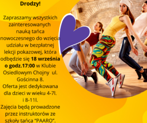 w Klubie Osiedlowym Chojny, ul. Gościnna 8. Oferta jest dedykowana dla dzieci w wieku 4–7 lat i 8–11 lat. Zajęcia będą prowadzone przez instruktorów ze szkoły tańca „PAARO”.